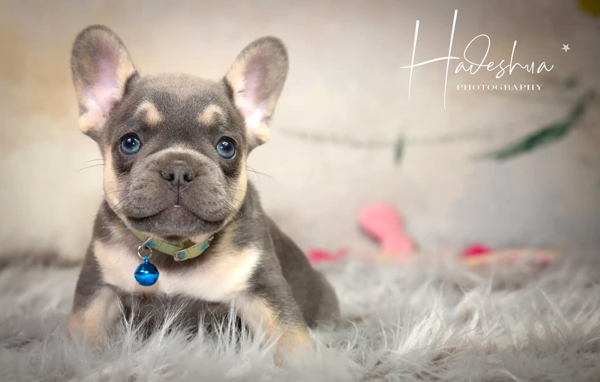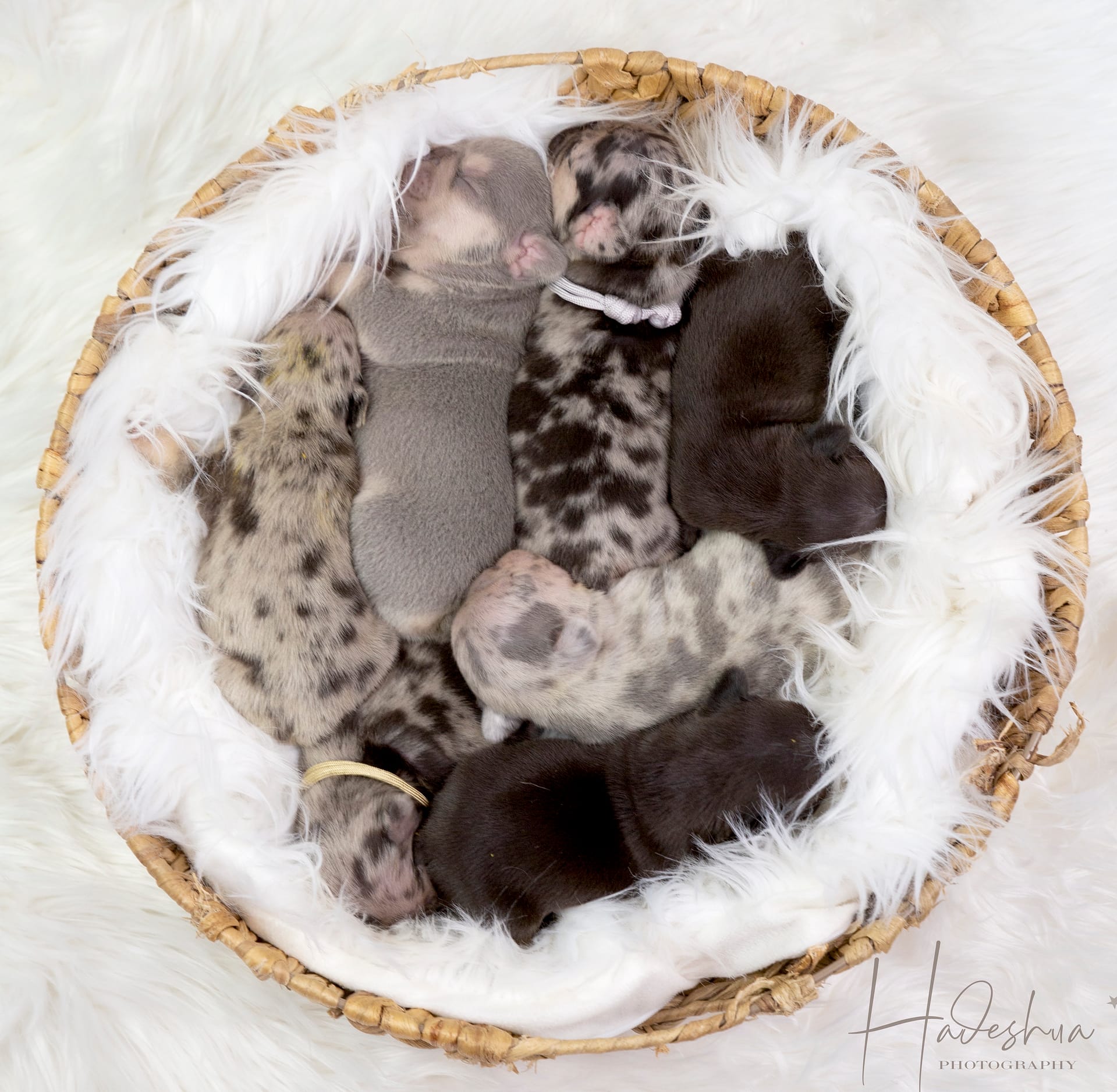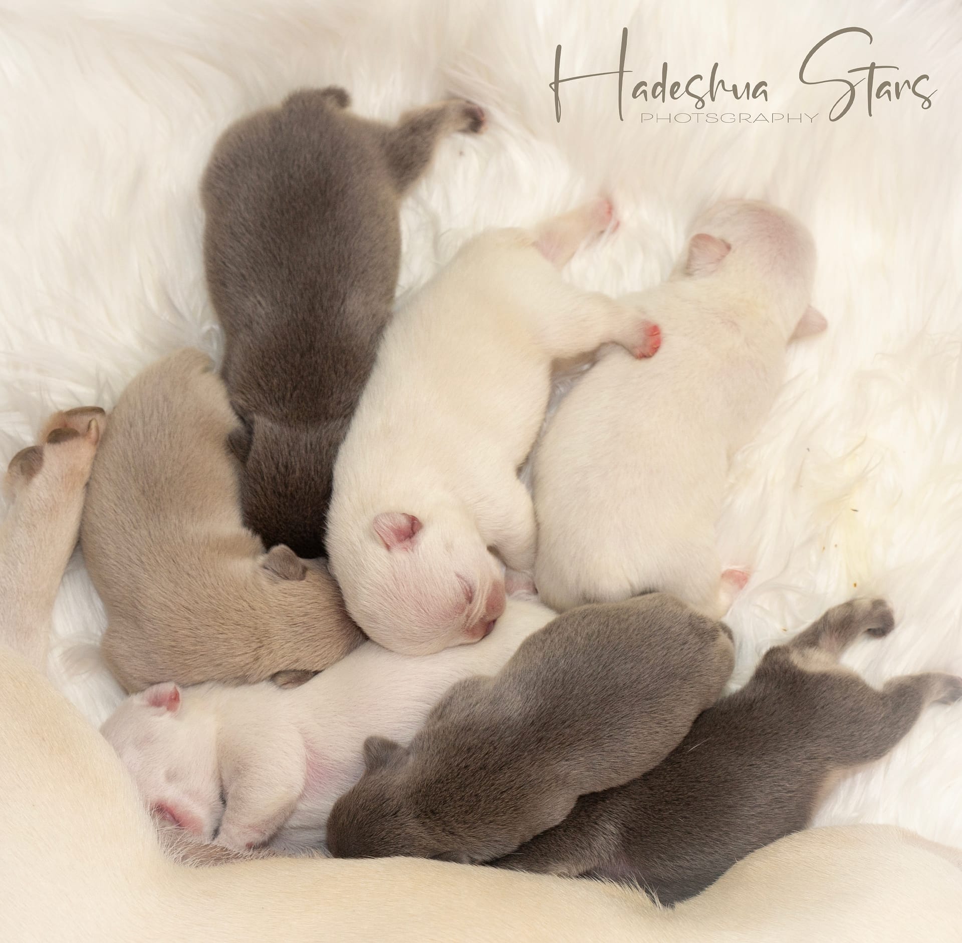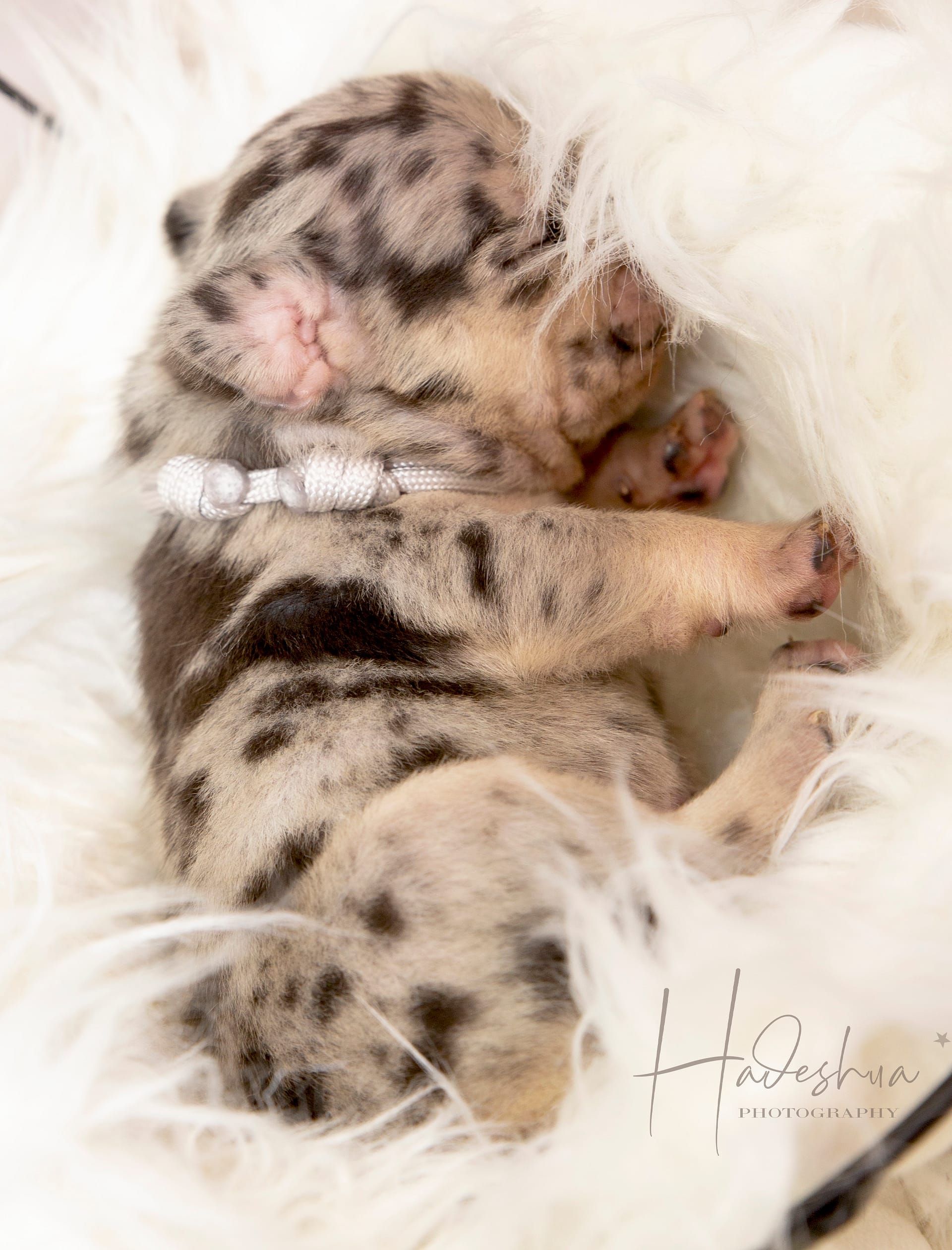 With loads and loads of love! For the first few days to a week or two, mom stays with her babies next to our bed so we can attent to mom & pups during night time hours.  As soon as we feel comfortable leaving mom alone with her puppies, they are moved to the nursery which is a nice, quiet room inside our house. Moms are fed a special diet consisting of Hill’s or Royal Canin Puppy Food, freshly cooked chicken, eggs and sometimes RAW.  As soon as puppies start to wiggle around and show interest in food, they are moved to the second puppy-room which is more central in our home in order for the puppies to get used to new sounds as well as being pampered by everyone who walks by… because who can resist a puppy? Soon they start wiggling those little tails when they are aware of us. At 6 weeks, we introduce them to grass during day time hours where they can start sniffing and exploring while playing their hearts out. The puppies can leave us after they are properly weaned from their mom which is after 8 weeks of age.